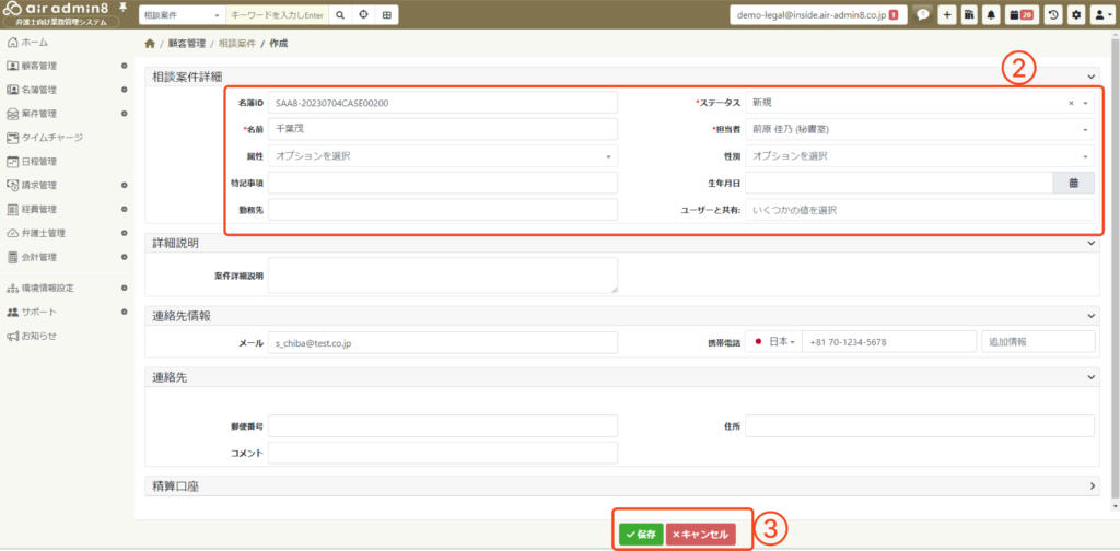 相談者の情報や日程・案件関連資料・メール履歴などが