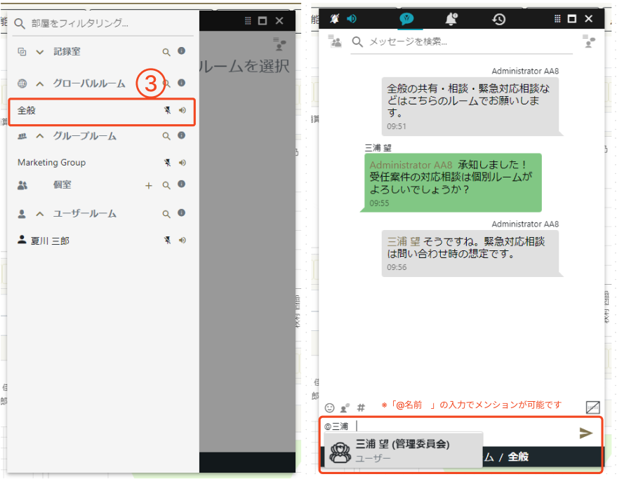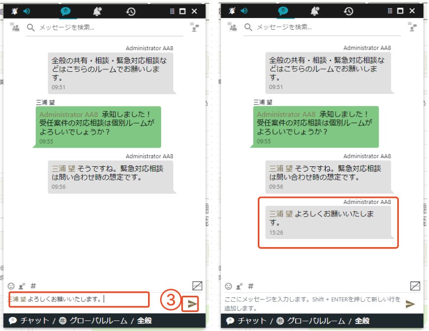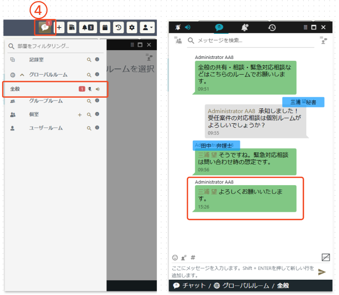 ③任意のルームをクリックし、テキストボックスにテキストを入力してenterまたは■マークをクリックで送信