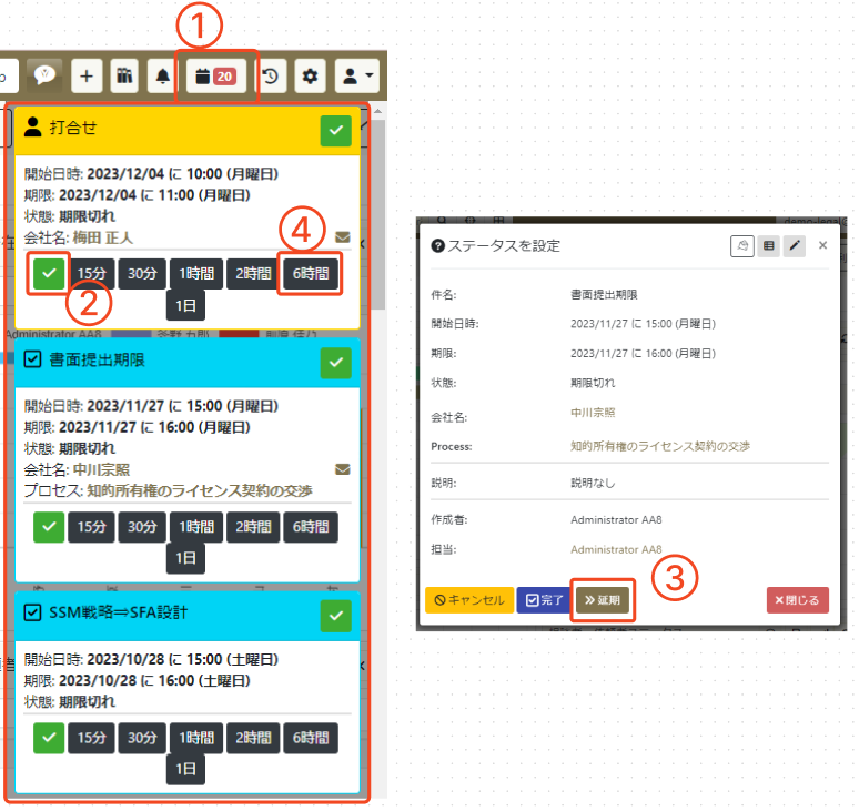 ④時間をクリックすると、指定時間後に再通知が設定されます。