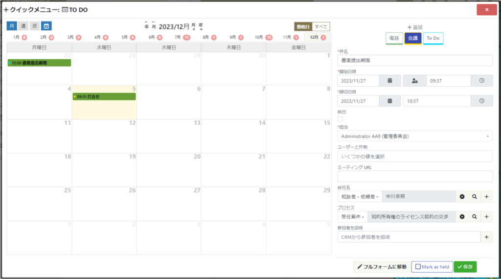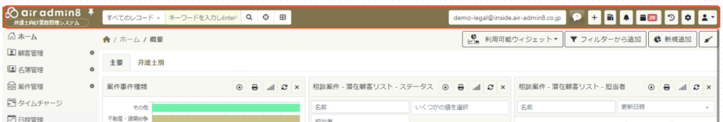ヘッダーは全画面共通で利用できる「レコード検索」「チャット」機能や、すぐに確認したい「通知」「日程通知」「社内FAQ」「閲覧履歴」、他にも「アカウント設定」「システム設定」「メールアドレス」の機能がご利用いただけます。