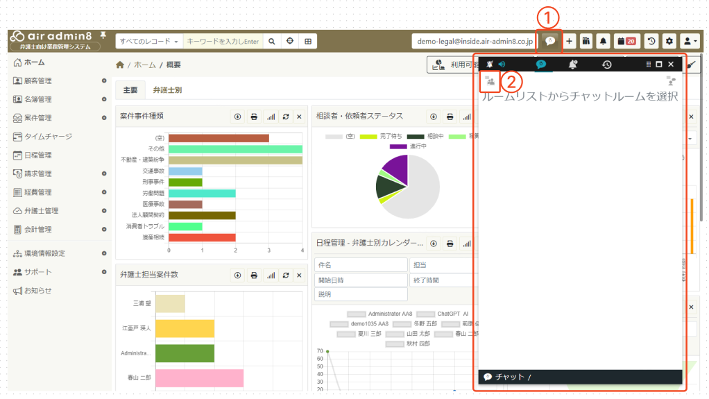 ①ヘッダーの■マークをクリックするとチャット画面が出てきます